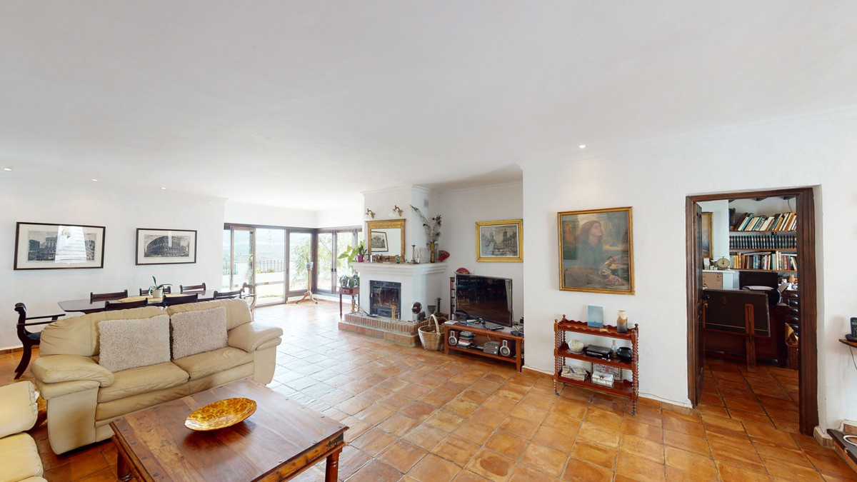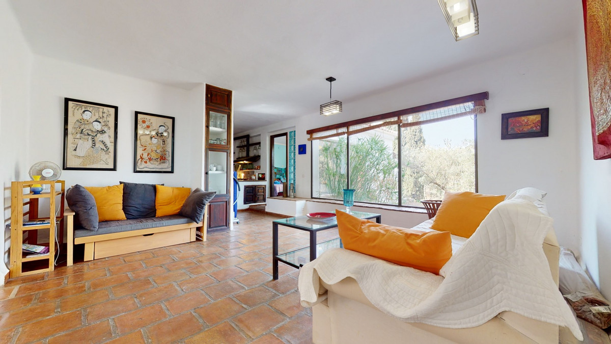 Are you looking for an oasis in harmony with nature? A place of peace and relaxation, where time runs a little slower? Yes?! Then we would like to show you this fantastic villa, in the mountains of Torrox. It offers an imposing, grand main house, a separate, small guest house and a pool, as well as 5,569 m2 of land, which is predominantly flat and thus offers countless possibilities. The layout of the property makes it possible to use the main house as two independent living units, with separate entrances. This fabulous property is perfect as a multi-family home, B&B or as an investment opportunity for a yoga center, event location, dance school or meditation temple.... An almost completely paved driveway leads you to a concrete parking area, which is partially covered. On this level is the charming guest cottage with its own covered terrace. It is equipped with a cozy, open living/dining area with a bed, a kitchen and a bathroom. The fireplace provides comfortable warmth in the cooler months. A driveway, as well as stairs, lead to the lower level. Another heavy wooden door with an iron horse door knocker grants entry into the spacious, imposing living area with fireplace, of the first part of the house. To the right is a guest toilet. Next to this is a room which is currently used as an office/library. It can also be heated to a comfortable temperature in the cooler seasons with the fireplace. We have adjacent a small, glazed room from which you can enjoy the view of the surrounding countryside. The large terrace at the front of the house offers breathtaking views of the famous white village of Frigiliana and the Sierra de Tejada in the background. Thanks to the hillside location, the hollow space under this terrace can still be closed and create more living space, if needed. From the living room, also with access to the terrace, one enters the spacious open kitchen with dining area. The interplay of traditional and modern has been perfectly achieved here. A glass patio door leads to the beautiful u-shaped and typical Andalusian courtyard with a fountain. On the second floor of the house there are three bedrooms and two bathrooms. The master bedroom has a large, modern bathroom with its own sauna, as well as a bathtub and shower. From two of the bedrooms there is access to an enchanted u-shaped balcony with views down into the Andalusian courtyard. Its wooden beams and plantings make it feel like you've stepped into another era. A corridor leads from this balcony to the second part of the house. On the second floor there is a bedroom with another fireplace, called the Sunroom because of its wall color. A staircase leads down to a huge open space with a large flat skylight that lets in natural light. The space can be used for a wide variety of possibilities. As a dance studio, atelier, or conference room. A feel-good temperature can also be created here with a great fireplace. On this level we also have a large heavy wooden door, the separate entrance to this part of the house. Right next to the entrance area there is a fully equipped bathroom. Through an open arch you enter a living area with a small, charming kitchen. Through almost floor-to-ceiling windows, you look out onto an idyllic pond and out into the countryside. There is another bathroom and two bedrooms, both with access to the outdoor area. The outdoor area includes a pool, many terraces with seating, a small vegetable garden and some olive trees. The bodega, or wine cellar, adds the finishing touches to the mansion and guarantees the right temperature for your wine. We are pleased to be able to present this dream property to you soon, either personally or via virtual viewing. Because this world, it is unique - just like our Axarquía. In Andalusia. On the Costa del Sol. Here, on the sunny side of life...