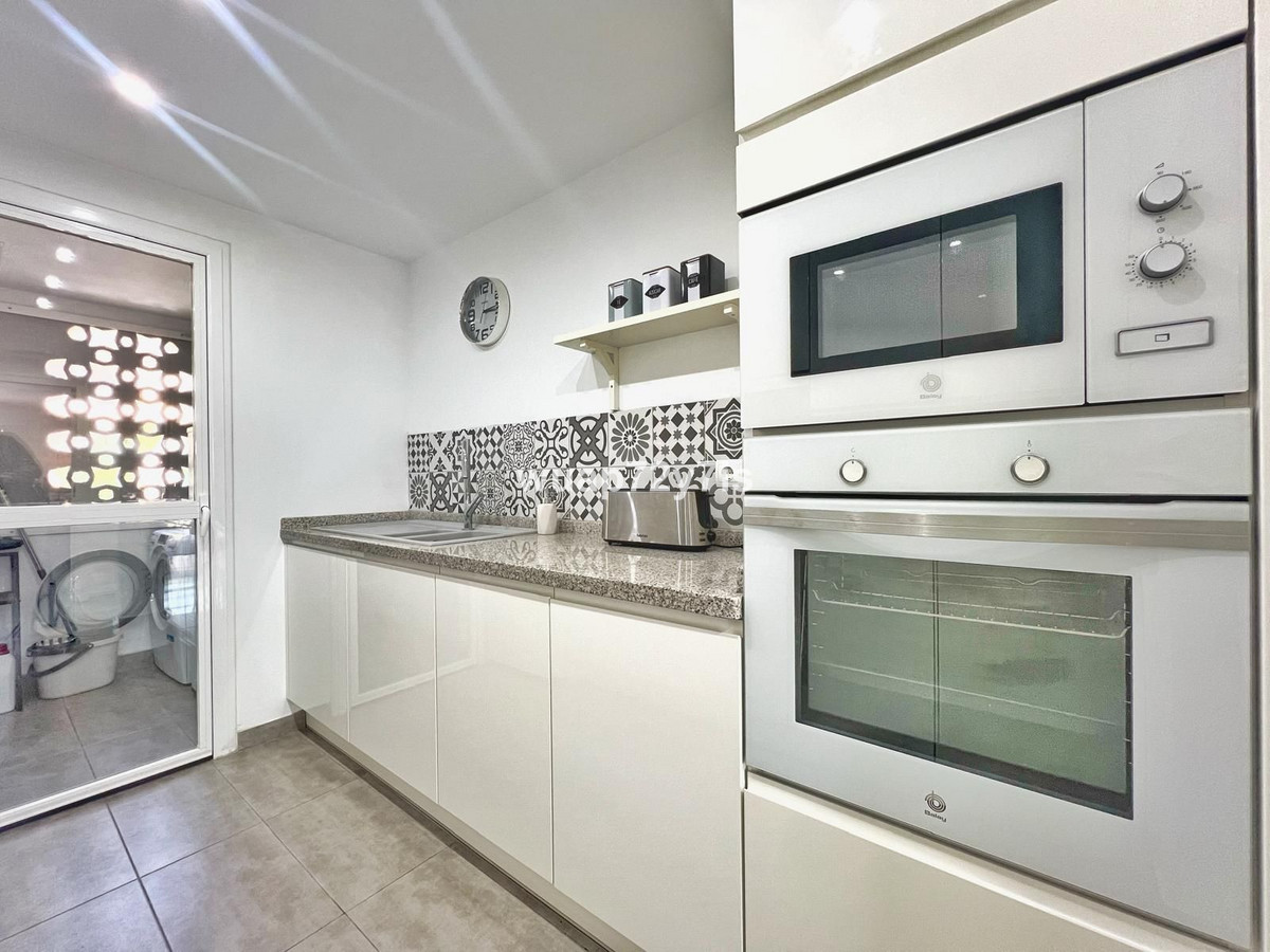 This three-bedroom apartment is located in the Costalita urbanization in Estepona. As you enter the apartment, you’ll find the living room on your left, which opens up to a terrace overlooking the pool. On the right-hand side, there is a fully equipped kitchen with a small laundry room. Walking straight down the hallway, you’ll come to three bedrooms and two bathrooms. One of the bedrooms features an en-suite bathroom for added comfort. Residents of the urbanization also have access to a shared swimming pool.