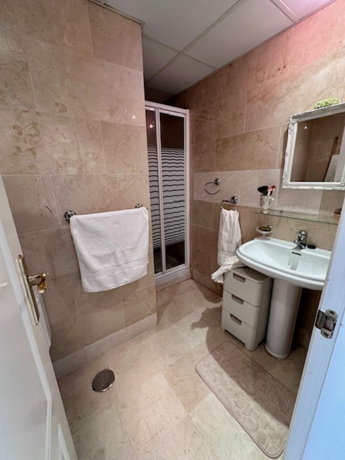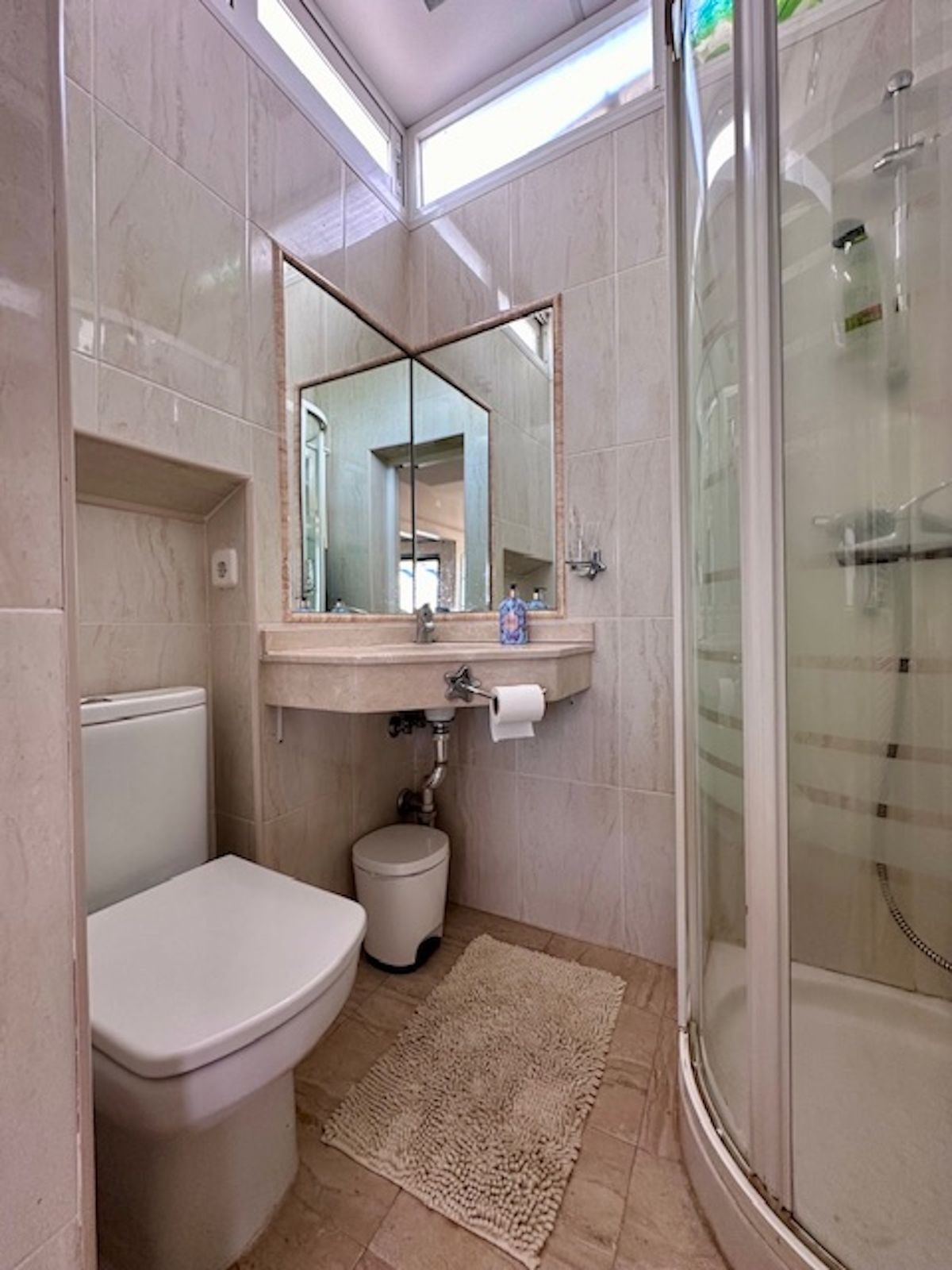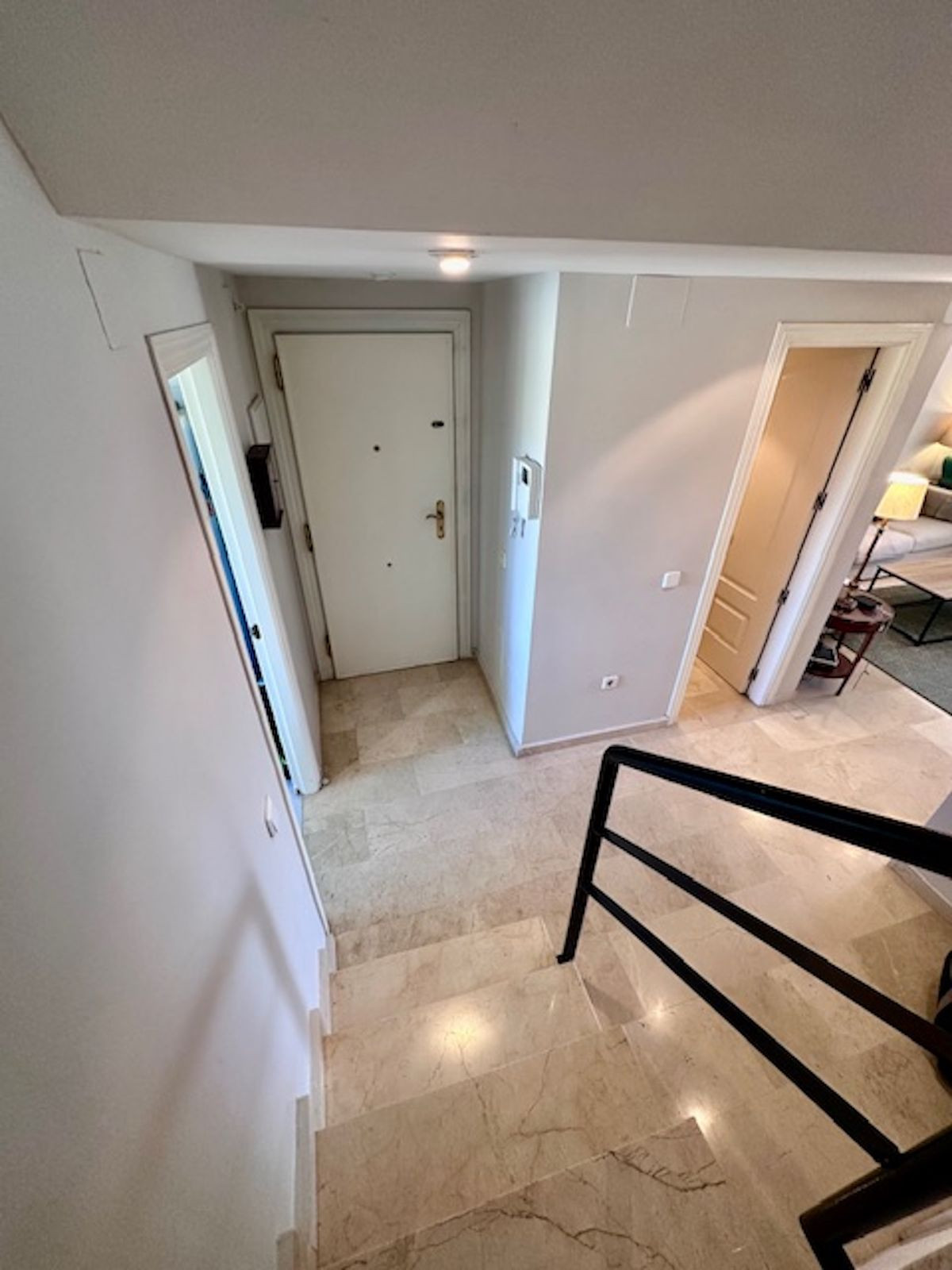 The living room has a guest bathroom and plenty of storage space, as all the stairwells have been closed off with wardrobes, maximizing the space.