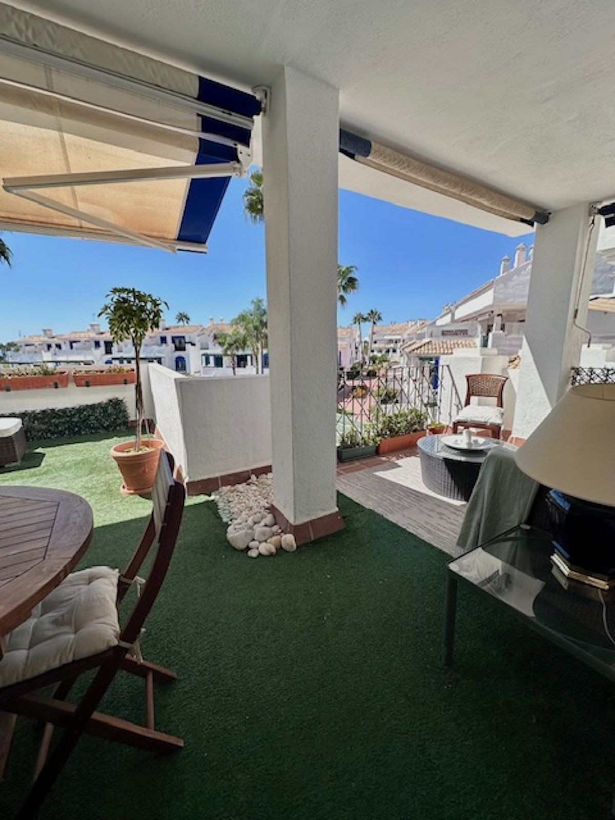 The living room opens onto a magnificent terrace, which is fully covered with awnings for winter use and offers stunning views of the development's pool and the sea, as this development is located on the beachfront.