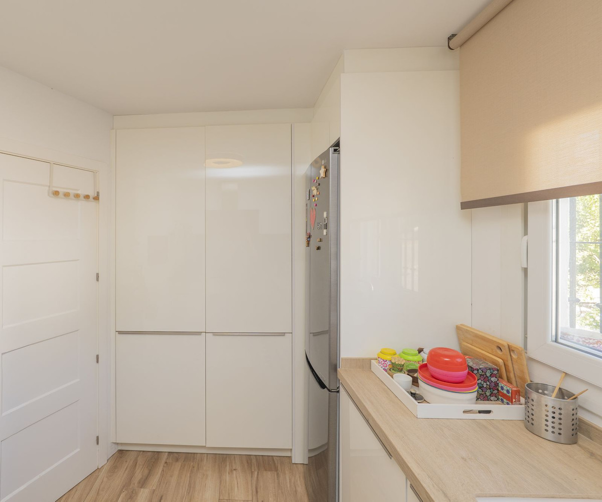 Charming two bedroom and two bathroom apartment boasting awesome sea views from its South facing beautiful terrace. Nestled in an Andalusian style urbanization with an enviable location at Las Lomas de Los Monteros, hence its stunning sea and coastal views and even the African littoral. This complex of whitewashed homes of a delightful rustic style comprises manicured gardens and a pool area with the mentioned jaw dropping views. The dwelling welcomes you with a distributor hall with the kitchen at the right followed by a complete bathroom; on the left side we find one bedroom, followed by the main bedroom with bathroom en suite. Continuing along the hall we reach the bright, as the whole property, living room with a distinguishable dining area and access to the cosy covered terrace and its enchanting views to the Marbella coast. A stylish home properly improved along the years with evidences of the improvements such as cladding, flooring, reformed bathrooms, fully fitted and equipped kitchen with first line appliances, A/C hot and cold, besides, an underground storage-cellar amounting 28sqm ... a wise first dwelling option or holiday home, surrounded by nature and forests oozing discretion, privacy and tranquility as its main features ... Come and check for yourself and you won't regret when you breathe and check the quiet oasis in which the property is located.