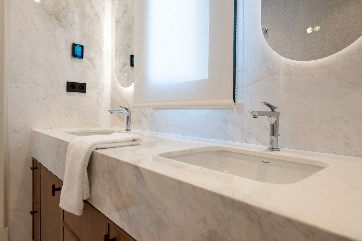 Offering approximately 270 sqm of refined interior living space, complemented by nearly 200 sqm of terraces, including a sundeck with green and sea views, this villa is thoughtfully designed for comfortable family living and sophisticated outdoor entertaining. The main floor features a bright and open-plan layout that seamlessly connects the kitchen, dining, and living areas. The interiors are styled in a neutral palette with elegant wood accents, creating a harmonious blend of modern design and natural warmth. Floor-to-ceiling glass panels on both façades flood the space with natural light and provide a striking line of sight from the entrance hall through to the terrace and beyond.