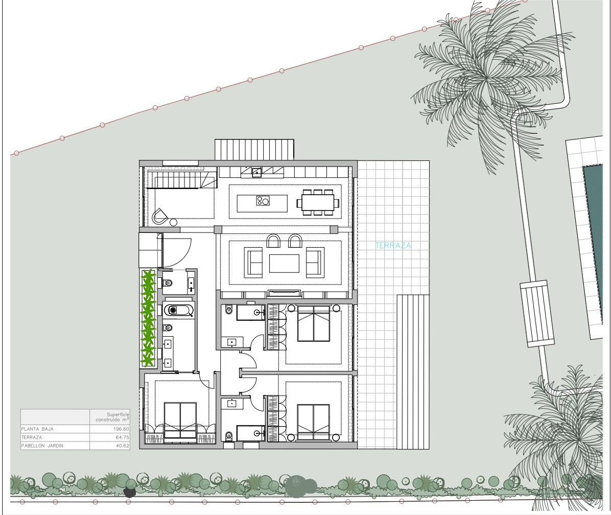 This level also hosts three spacious en-suite bedrooms, each with tasteful finishes and easy access to the outdoor areas. The living and kitchen areas open directly onto a large, partially covered terrace that overlooks the beautifully manicured two-level garden and the inviting swimming pool area. Adjacent to the pool is a stylish outdoor kitchen and barbecue area, perfectly positioned beside a generous sunbathing terrace, ideal for entertaining guests or relaxing in privacy.